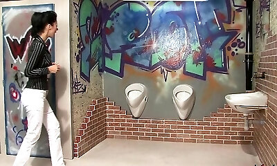 Alex More is groping her pussy in a green restroom and sucking a dick through a gloryhole
