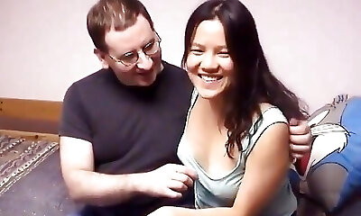 Slender schoolgirl pleased her bulky stepfather with her freshly shaved pussy.
