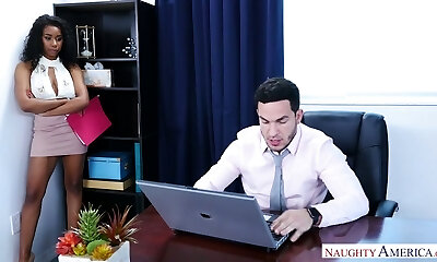 Huge-chested exotic slut Serena Ali has steamy doggy posture sex with her white macho in the office