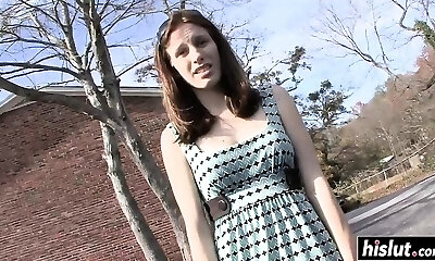 Hitchhiking sandy-haired cheerleader Eva Berger banged in the car