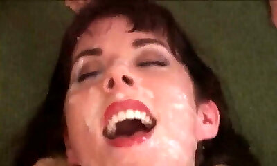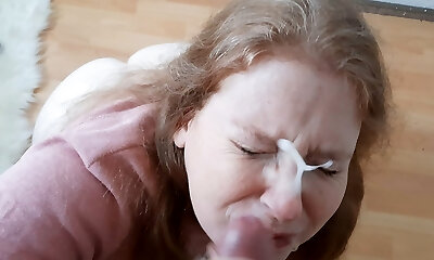 Foxy peach gets jism load on her face gulping all the cum