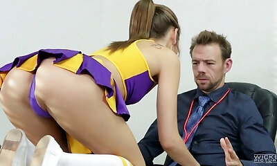 Cheerleader cutie gives the coach a fellatio and rides his dick